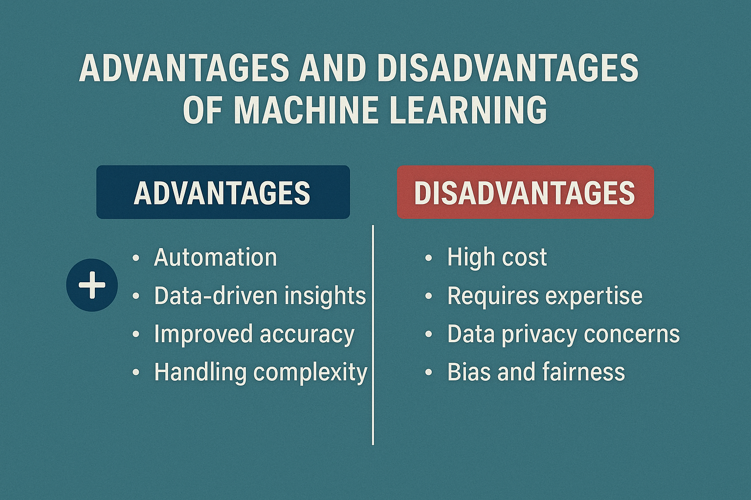 Machine Learning is a powerful tool that offers significant benefits such as automation, personalization, and improved efficiency. However, its challenges, like high costs, data dependency, and potential biases, cannot be overlooked. Understanding the advantages and disadvantages of machine learning helps businesses and individuals make informed decisions about its adoption